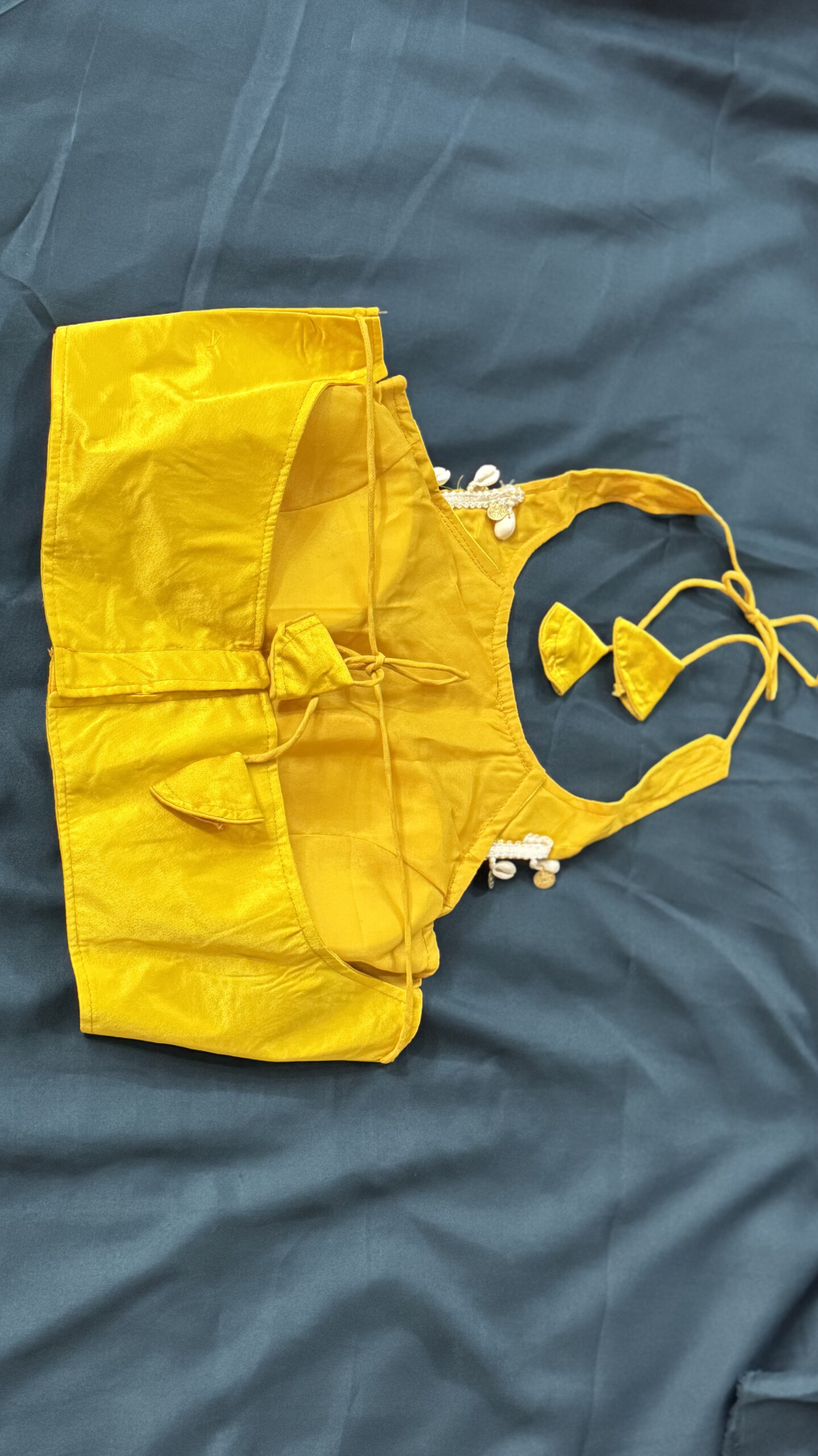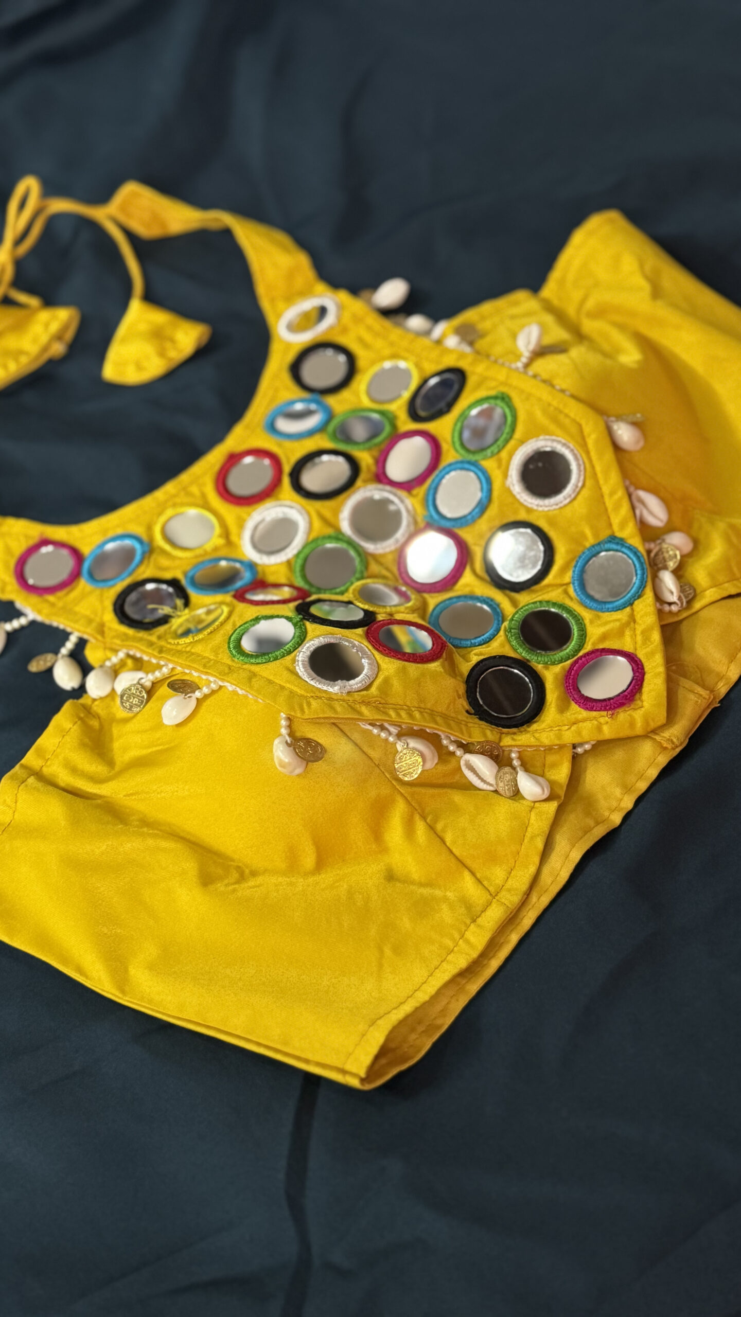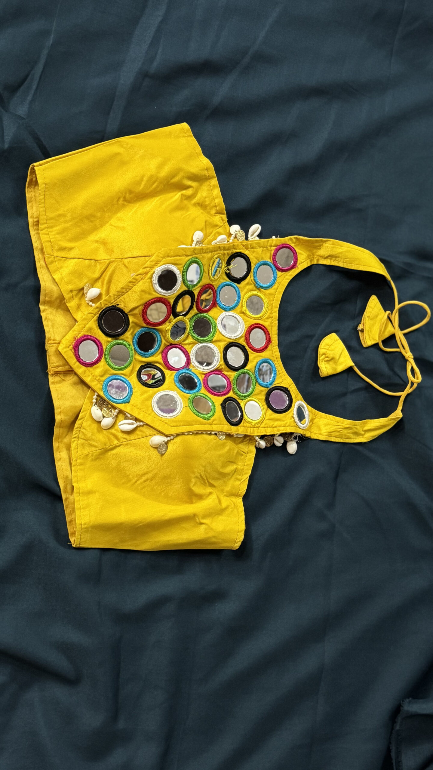 Brighten up your festive and Navratri looks with our Sunehri Mirror Work Blouse. Crafted in vibrant yellow cotton, it features intricate hand‑done mirror embroidery with multicolored accents and charming shell details. Perfect to pair with lehengas or skirts for a statement ethnic vibe.