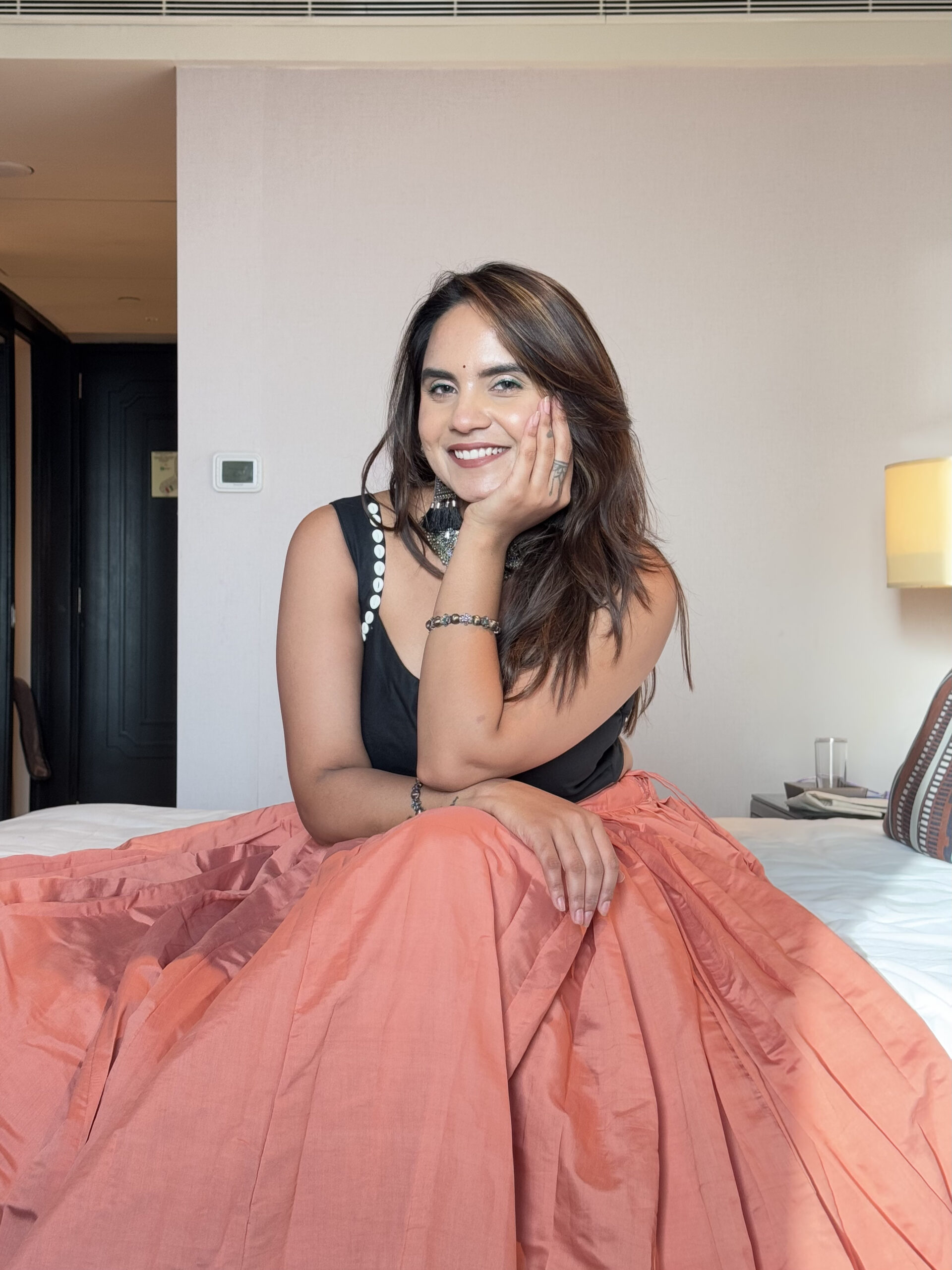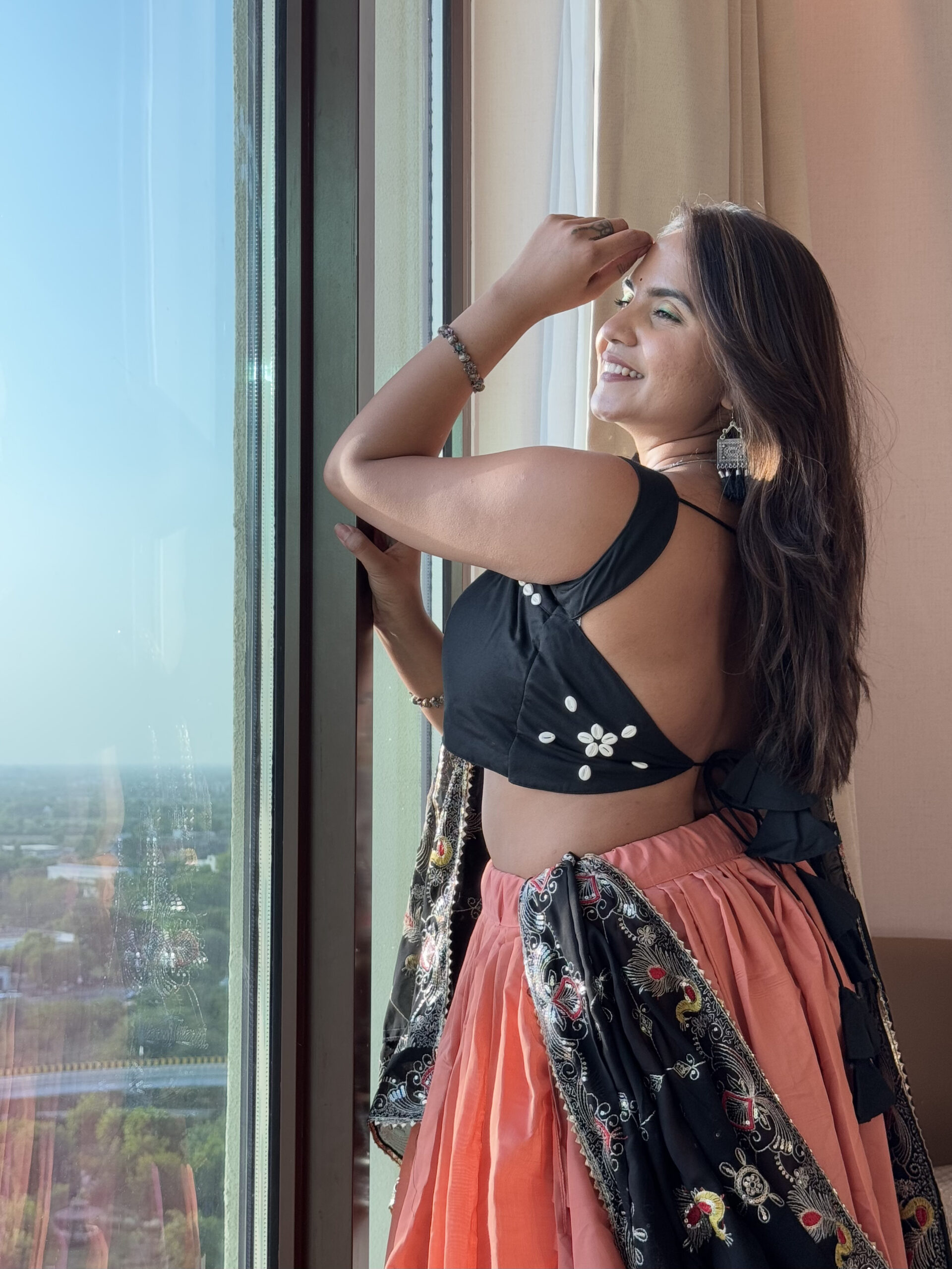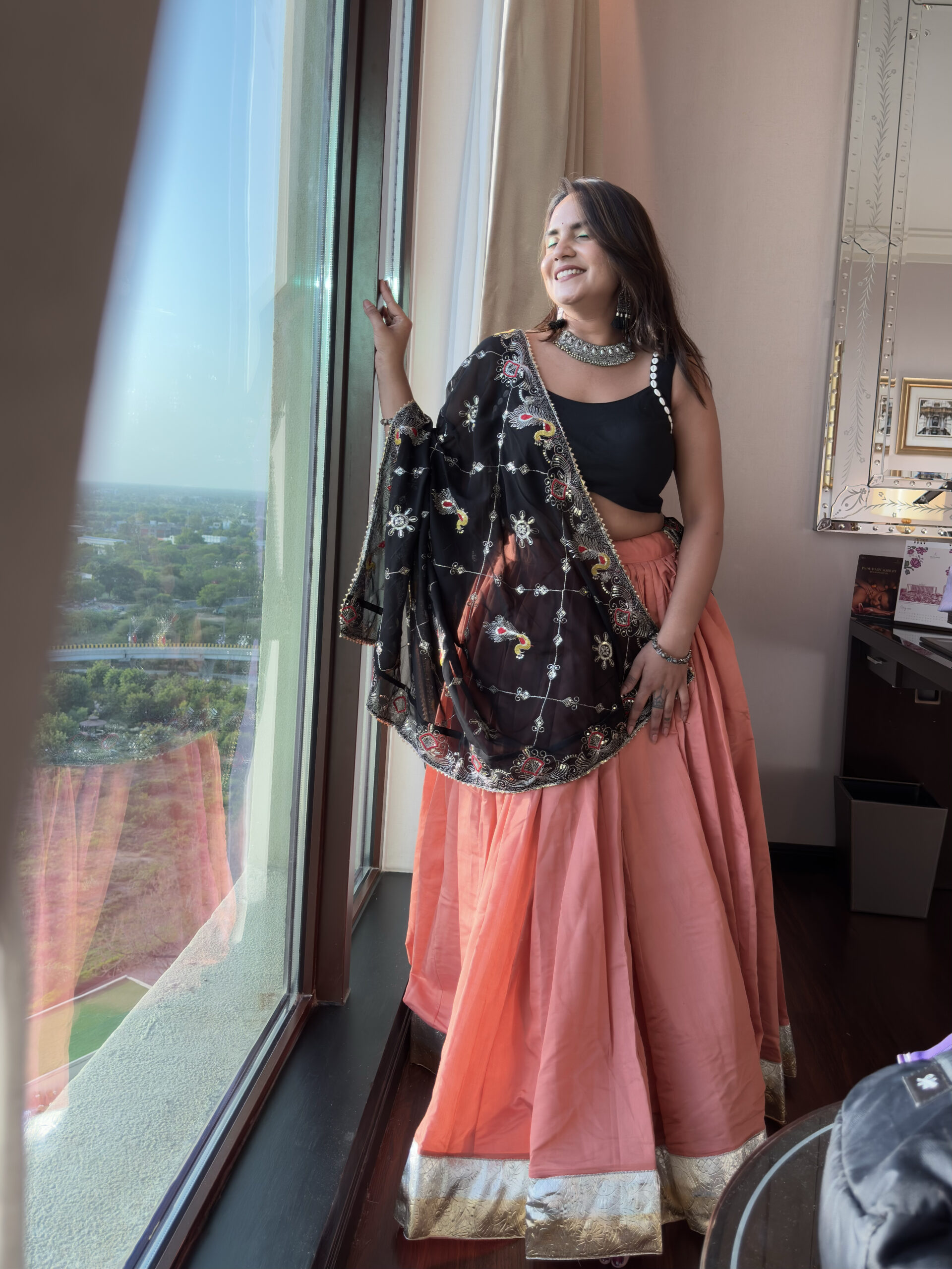 🖋️ Turn heads this festive season with our Noorika Arab Silk Lehenga Set. The soft peach‑toned lehenga, crafted from luxurious Arab silk, flows with effortless grace, while the sleek black blouse adds a bold contrast. A beautifully vintage black dupatta with mirror and thread work completes the ensemble, making it perfect for Navratri nights, sangeet celebrations, or any occasion where tradition meets glamour.
