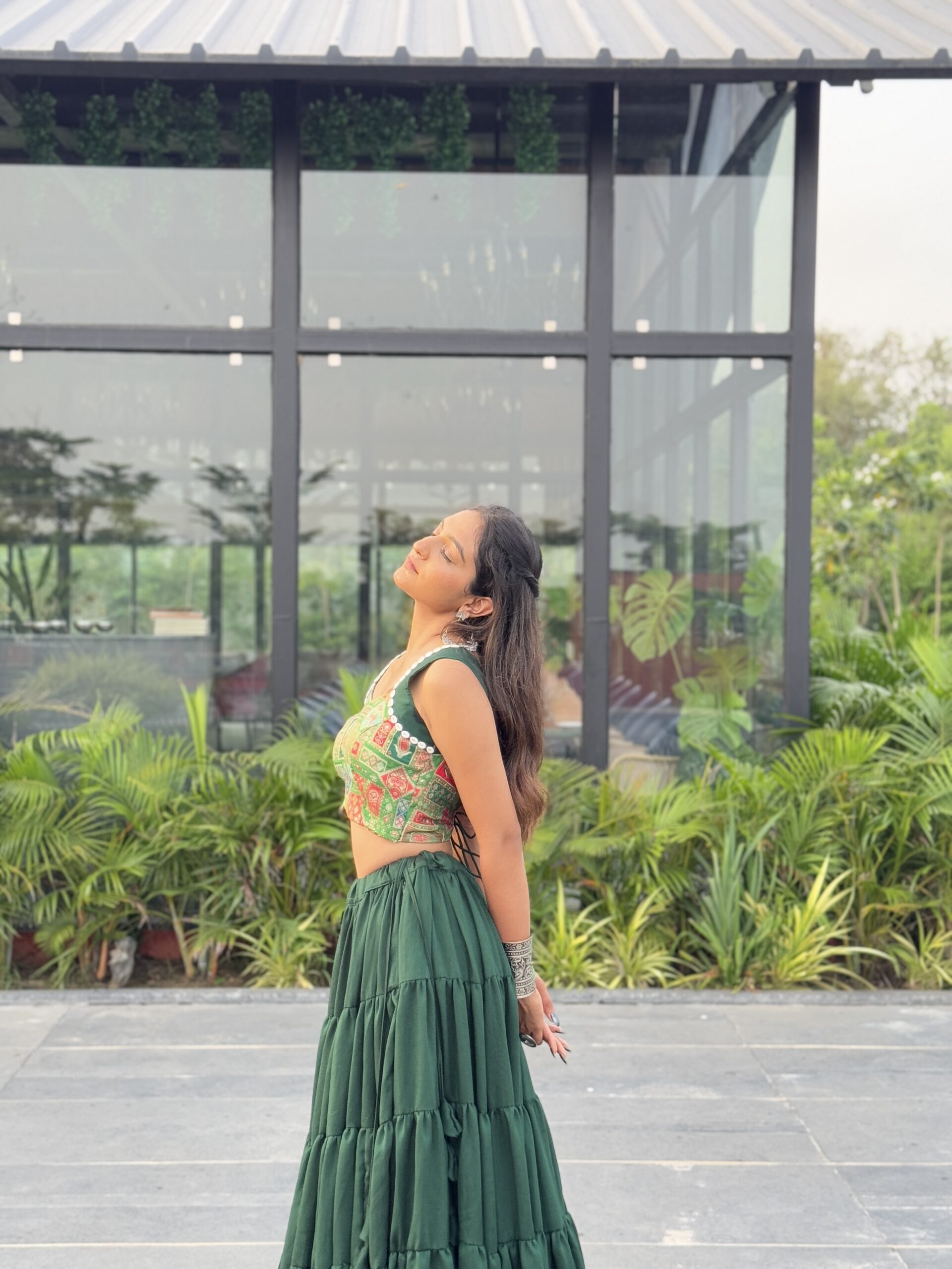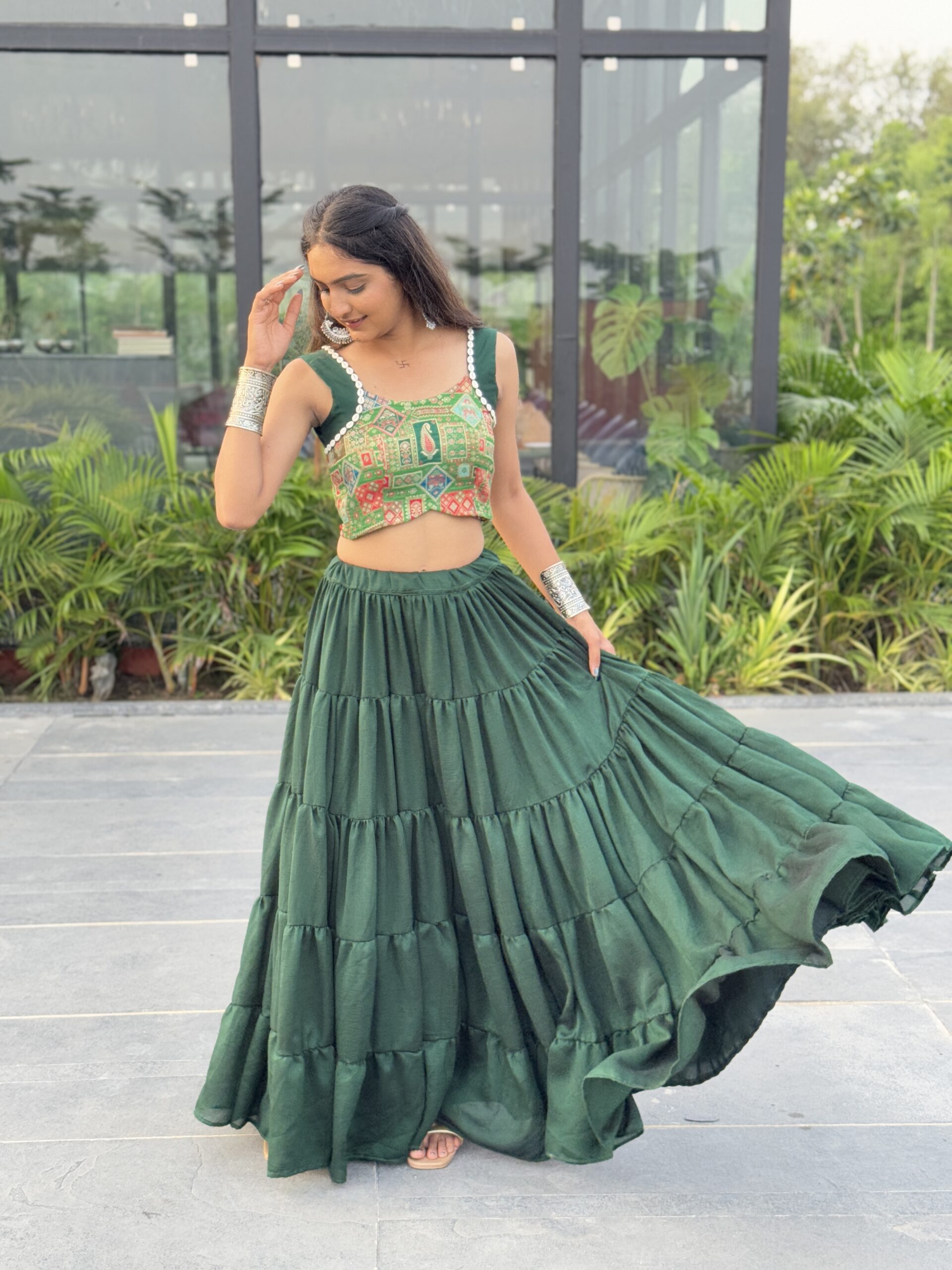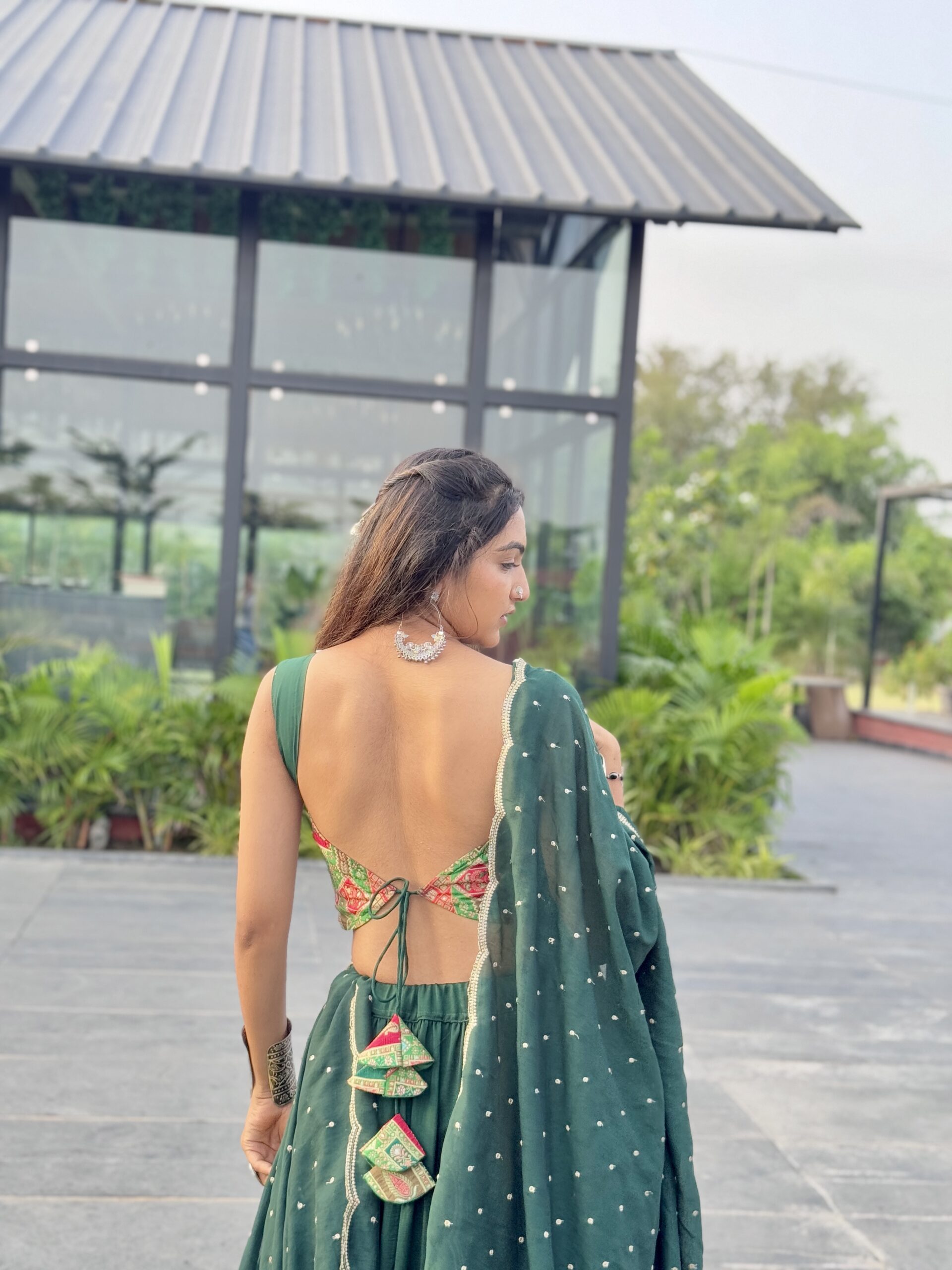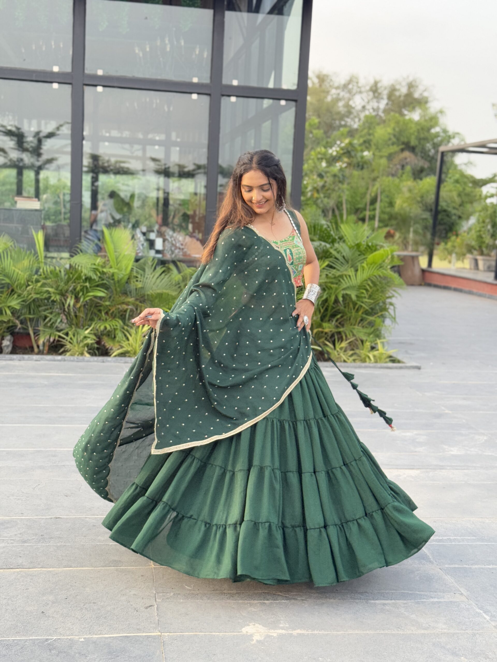 Drape yourself in the flowing elegance of Emerald Leher, a statement lehenga in deep green hues. Crafted from siffon georgette, it features a voluminous 15-meter flare that moves like waves with every twirl. The ensemble is paired with a delicately embroidered choli and a dotted dupatta that adds subtle festive sparkle.
