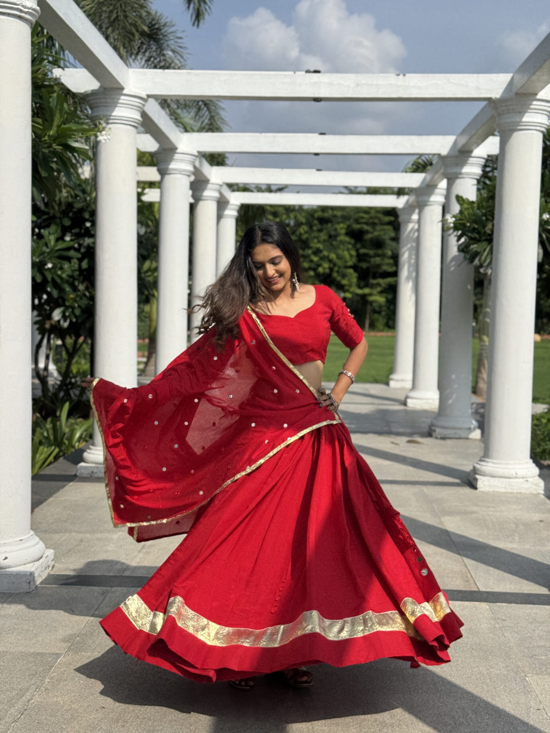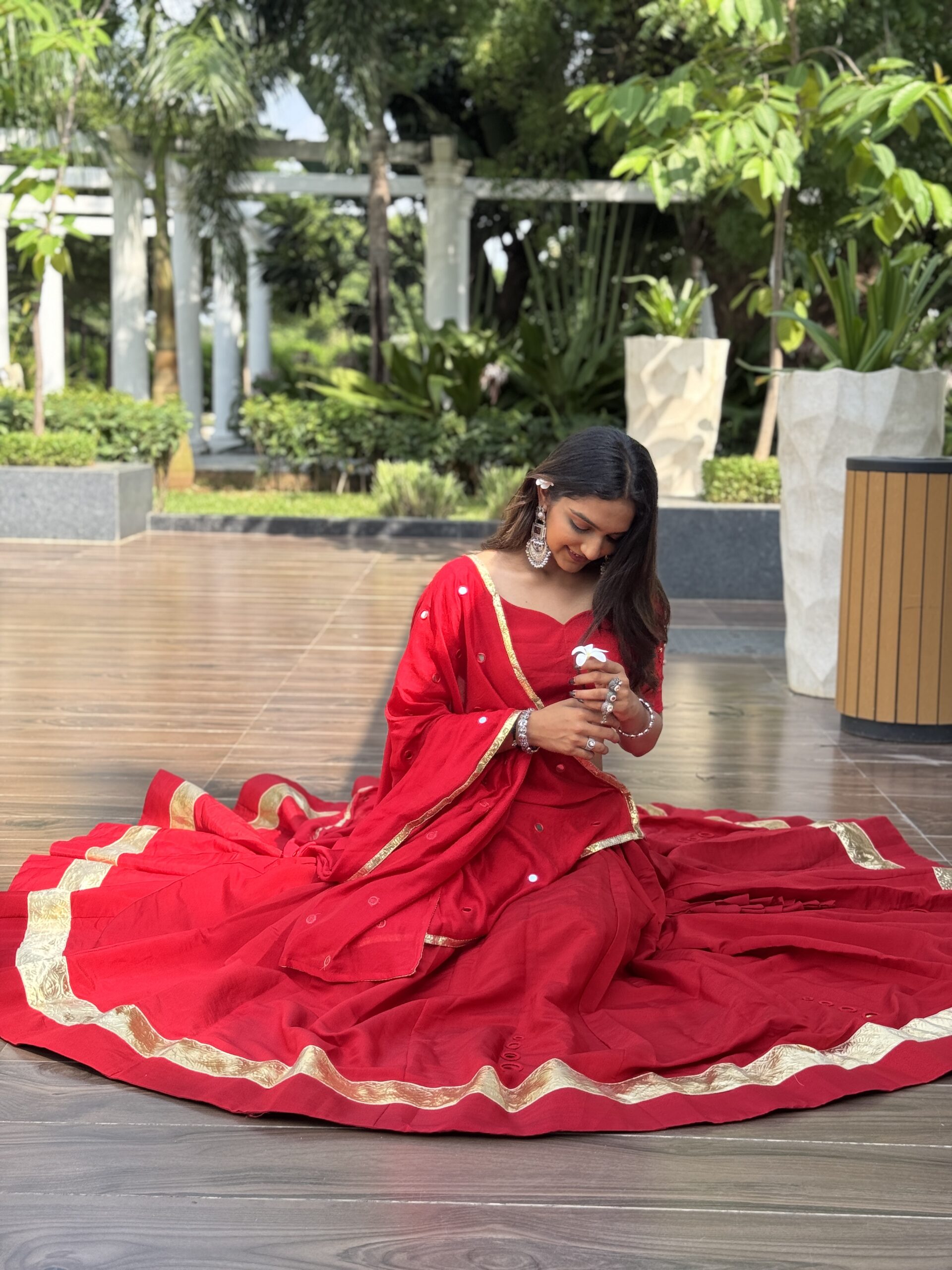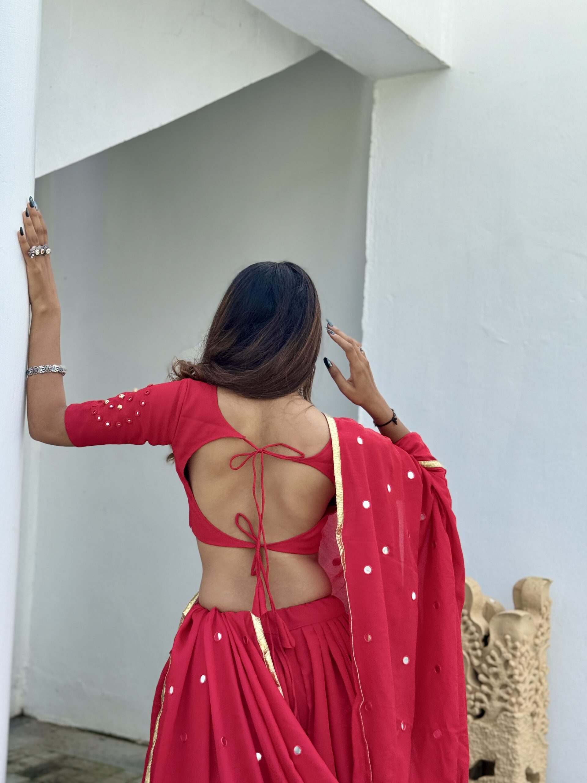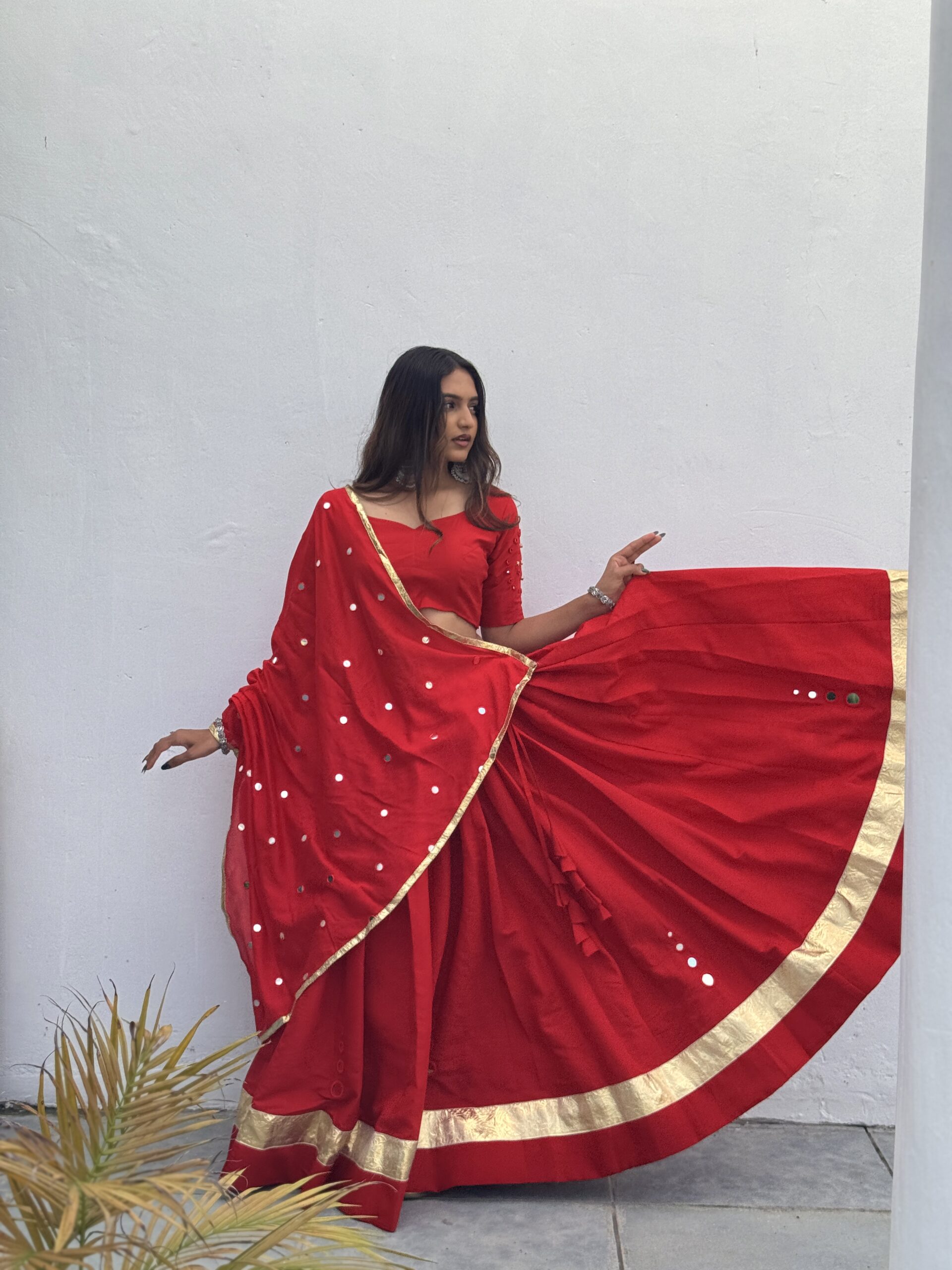 The blouse and dupatta are adorned with handcrafted mirror work, adding a subtle sparkle to complete this timeless festive look.