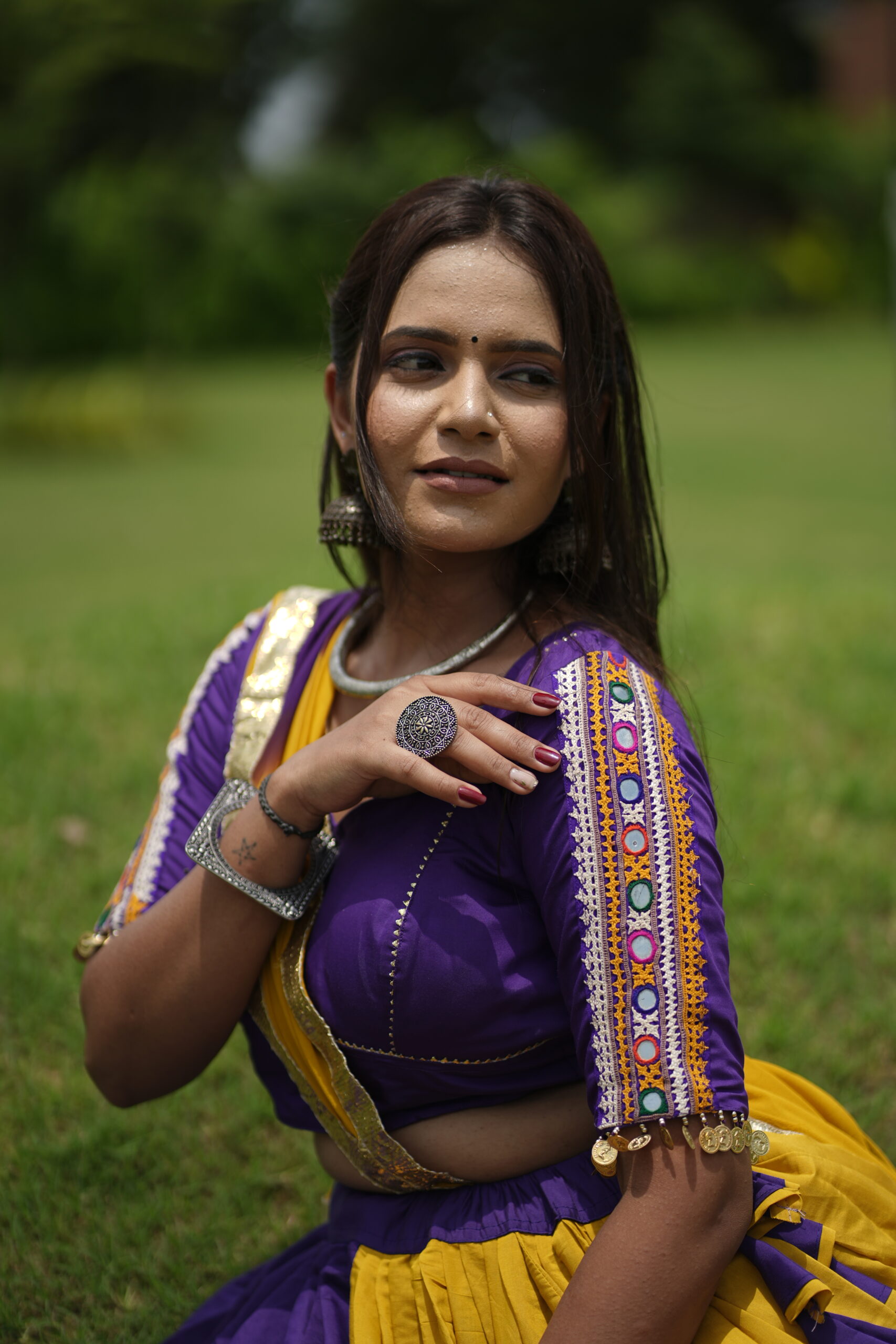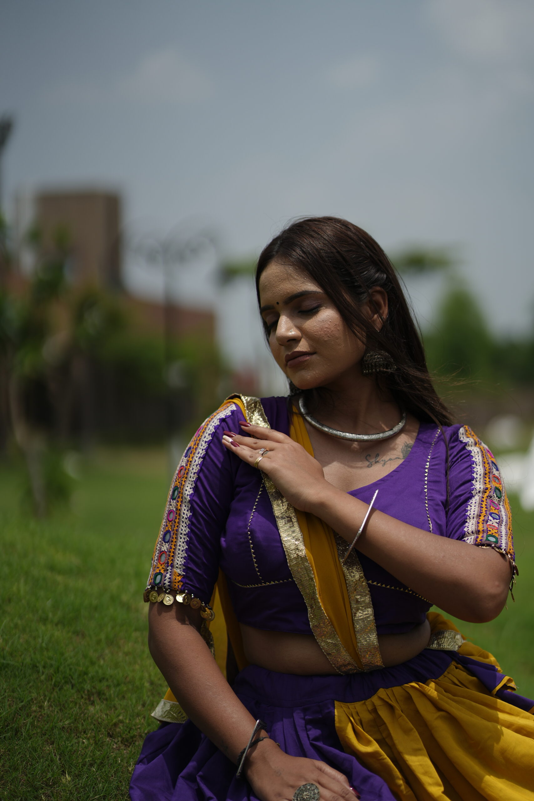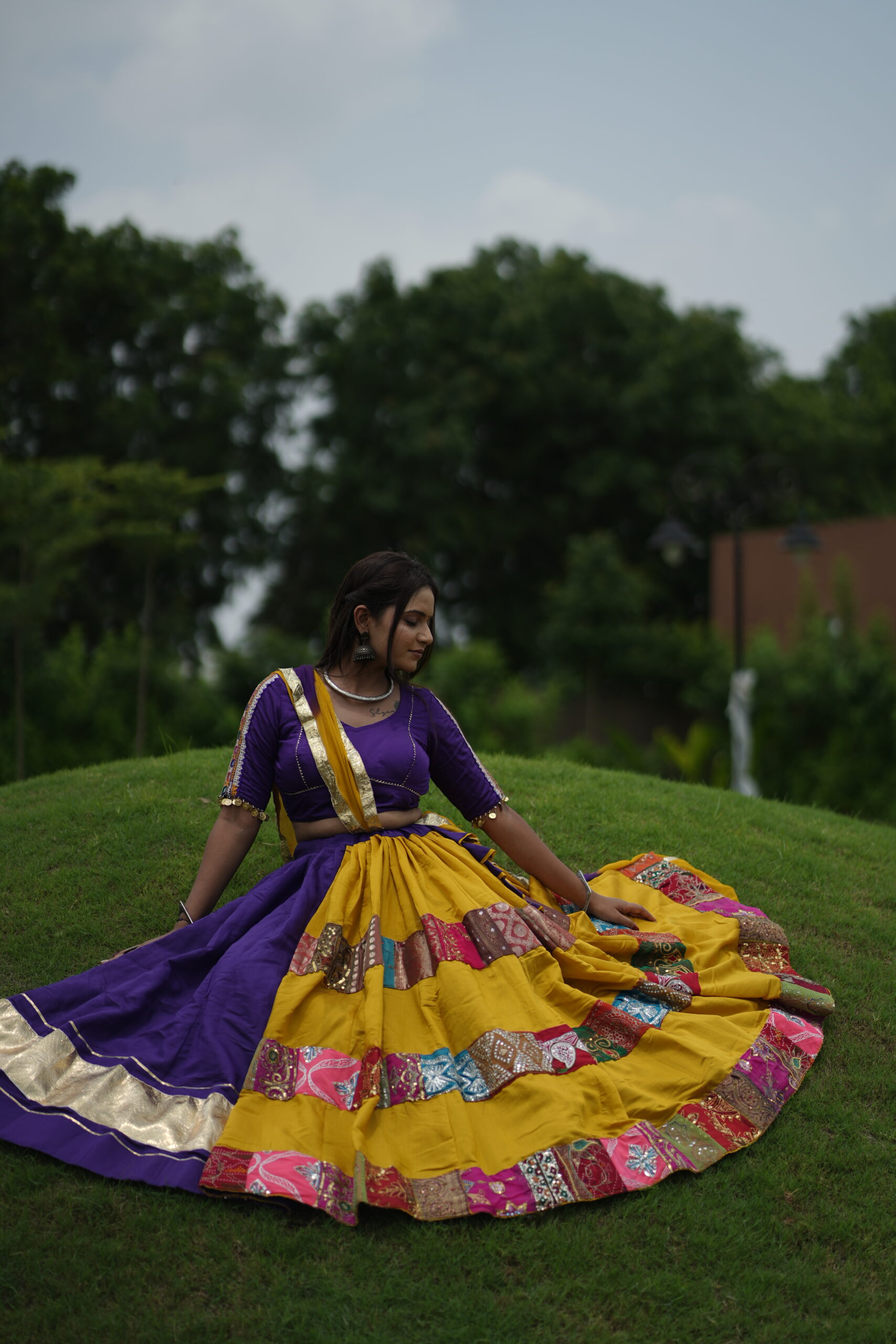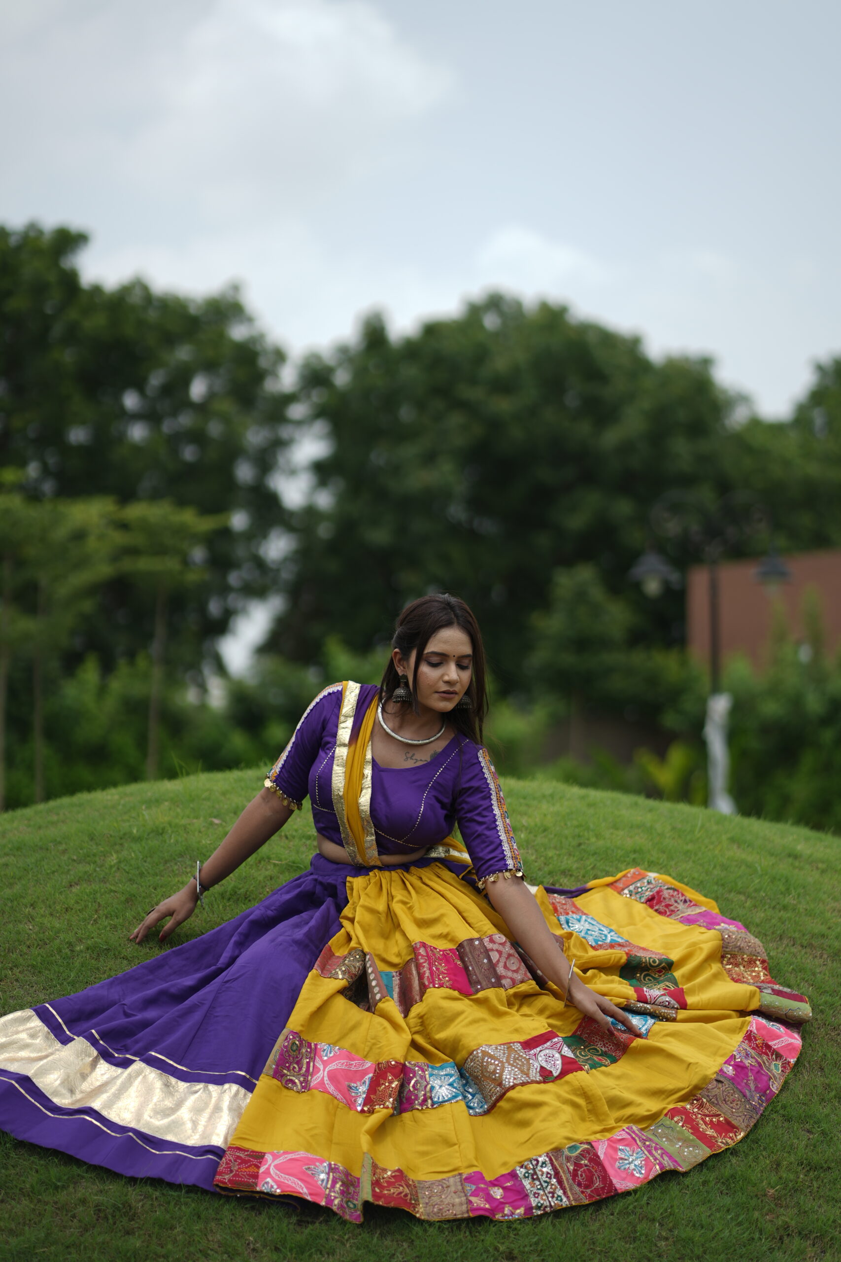 Elevate your traditional look with this stunning yellow and purple chaniya choli set, adorned with intricate patchwork detailing. The vibrant colors and unique design make it perfect for festive occasions and cultural celebrations.