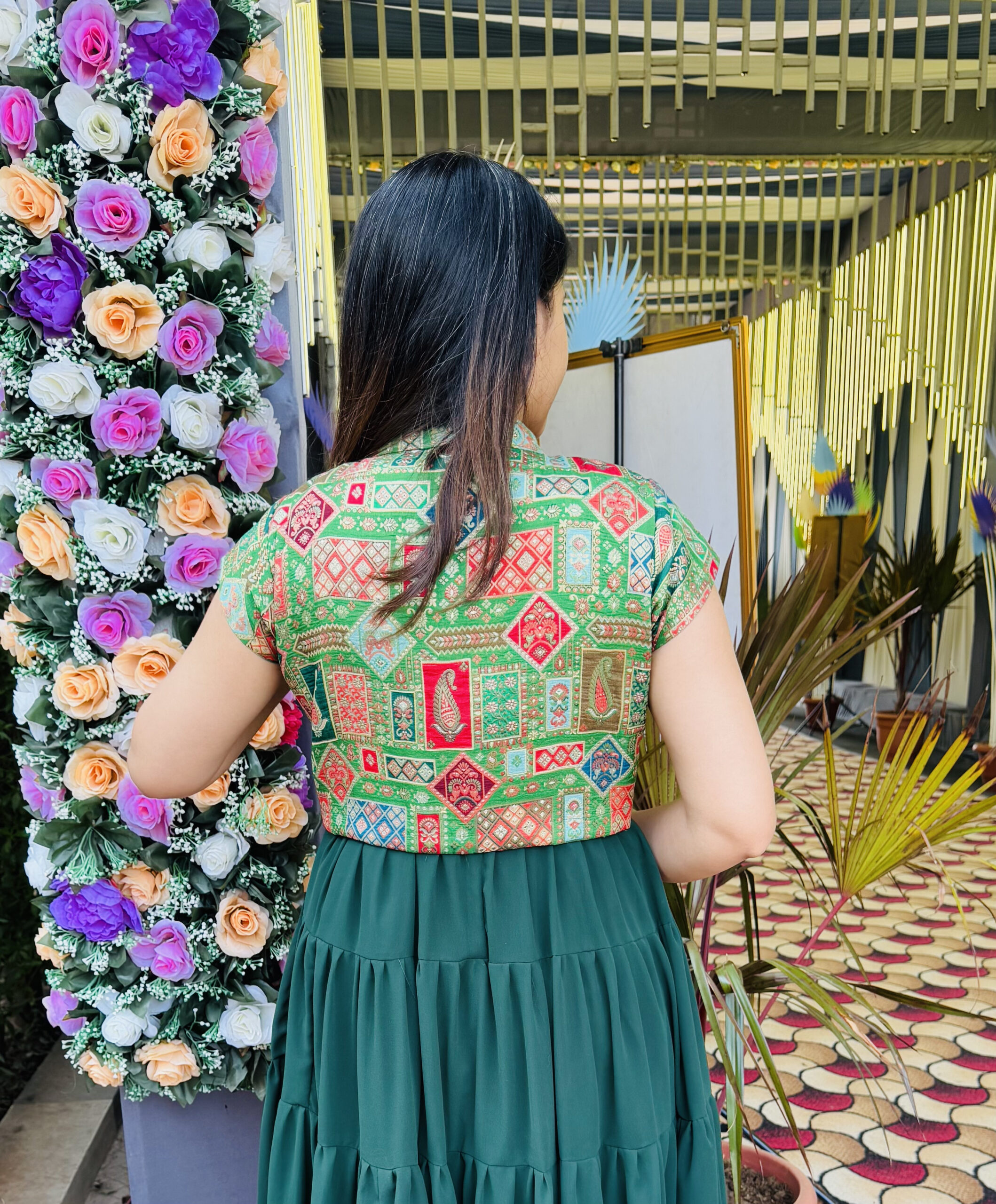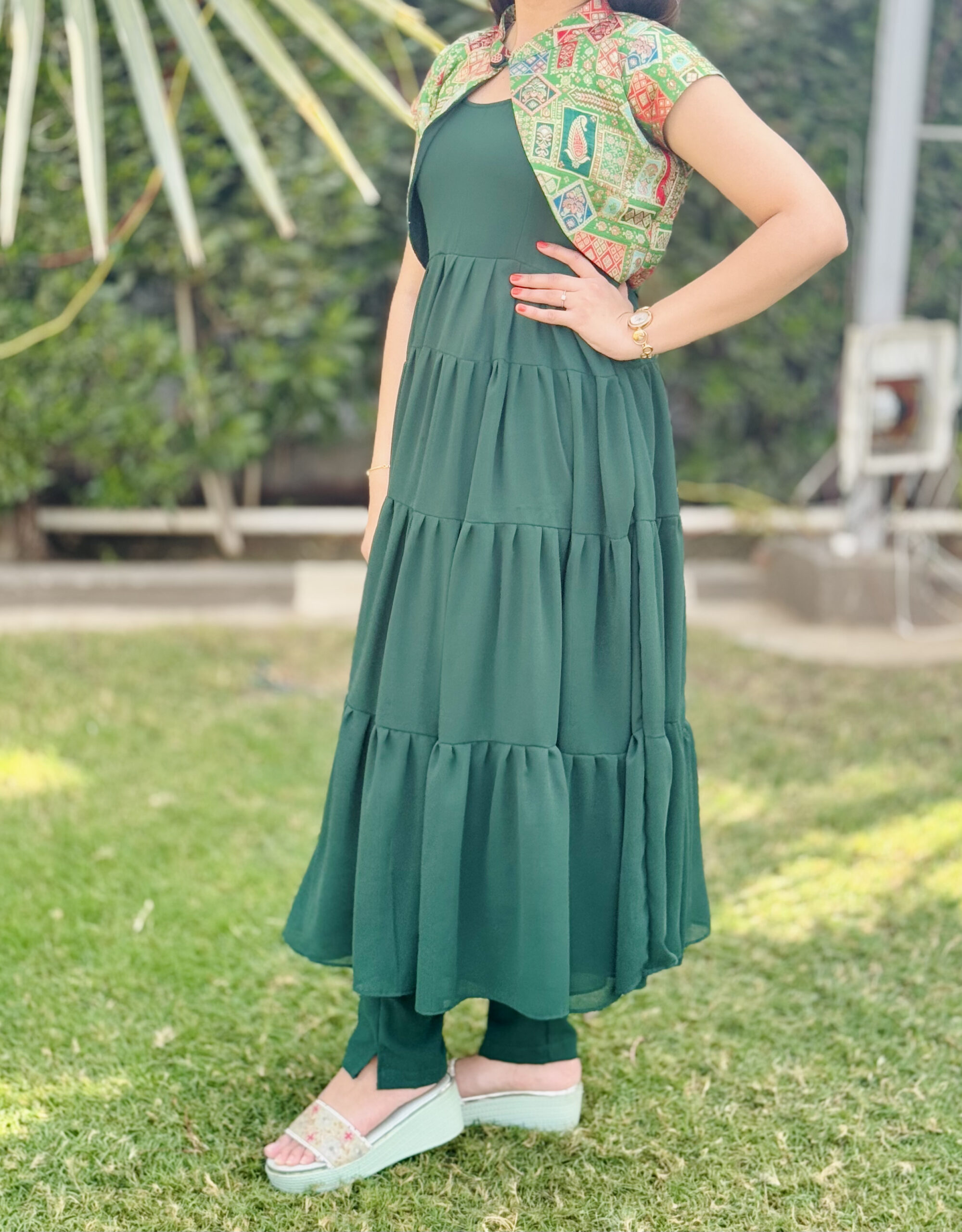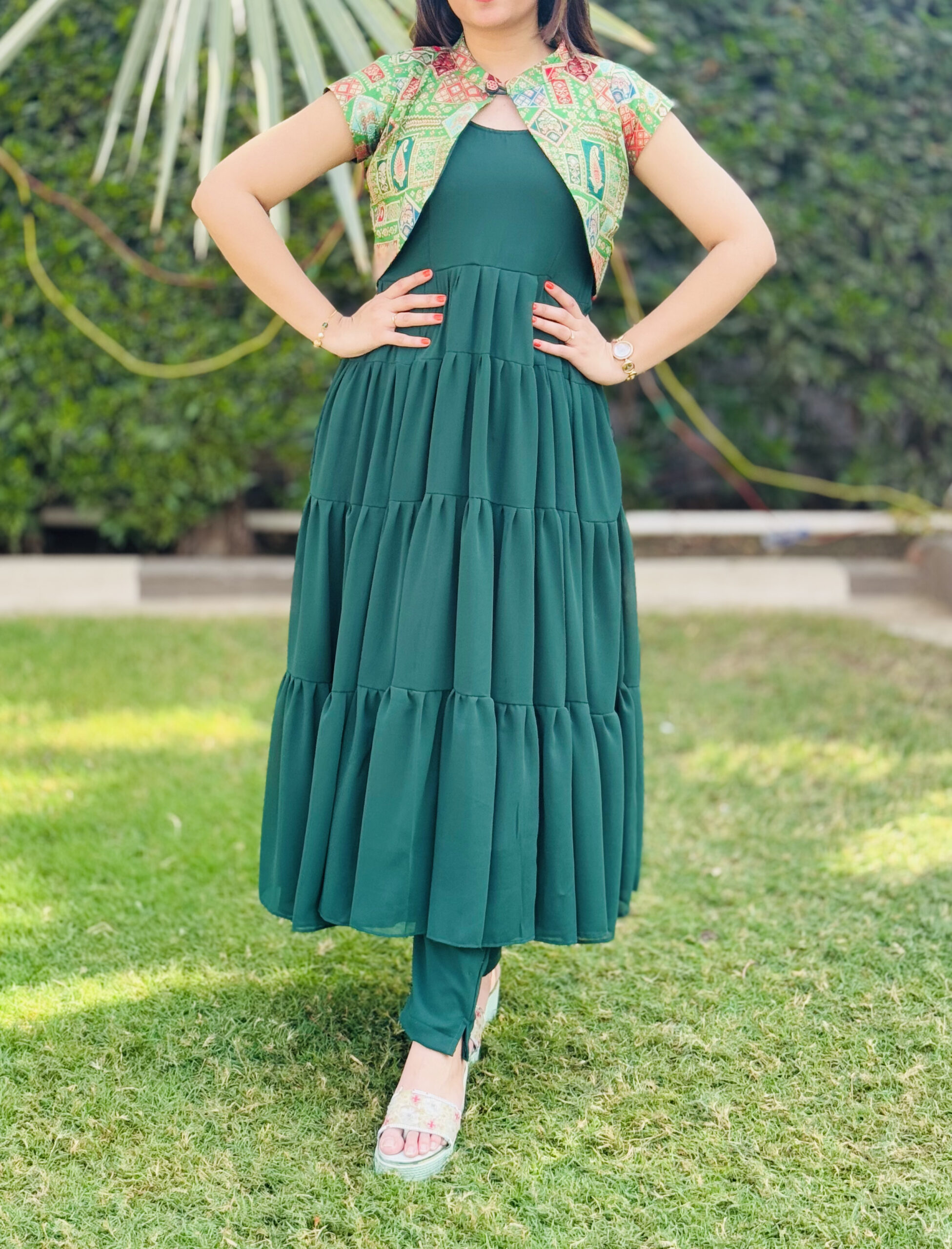 A stunning Indowestern outfit blending traditional charm with modern flair. Features a flowy emerald green georgette dress with tiered layers, paired with a vibrant patterned work blazer adding a touch of sophistication. Perfect for festive occasions or cultural events.