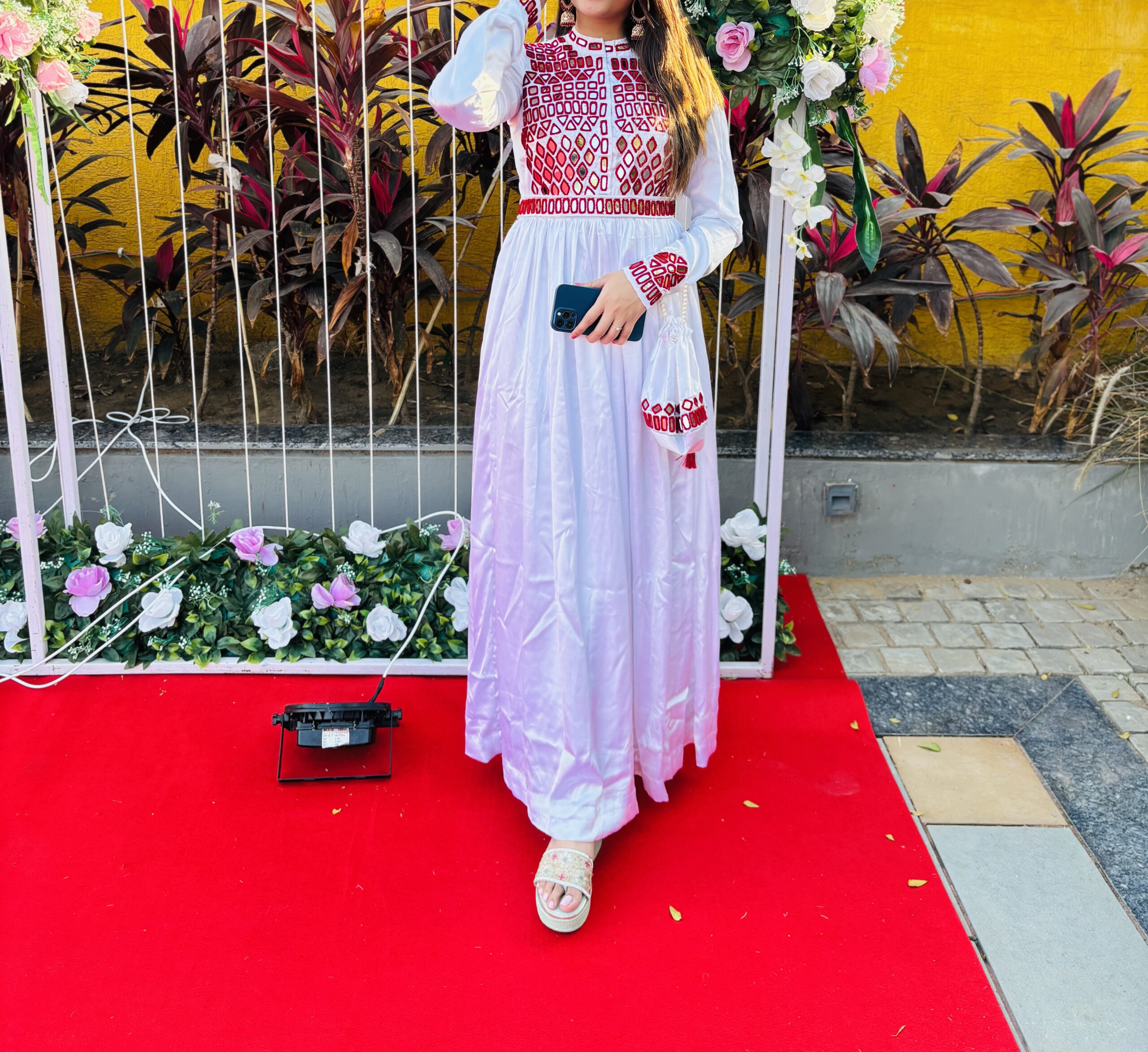 A regal modern traditional Anarkali-style gaji silk dress with intricate red mirror work embroidery. No dupatta included, but can be paired with one for added grandeur. Care: Dry clean only.