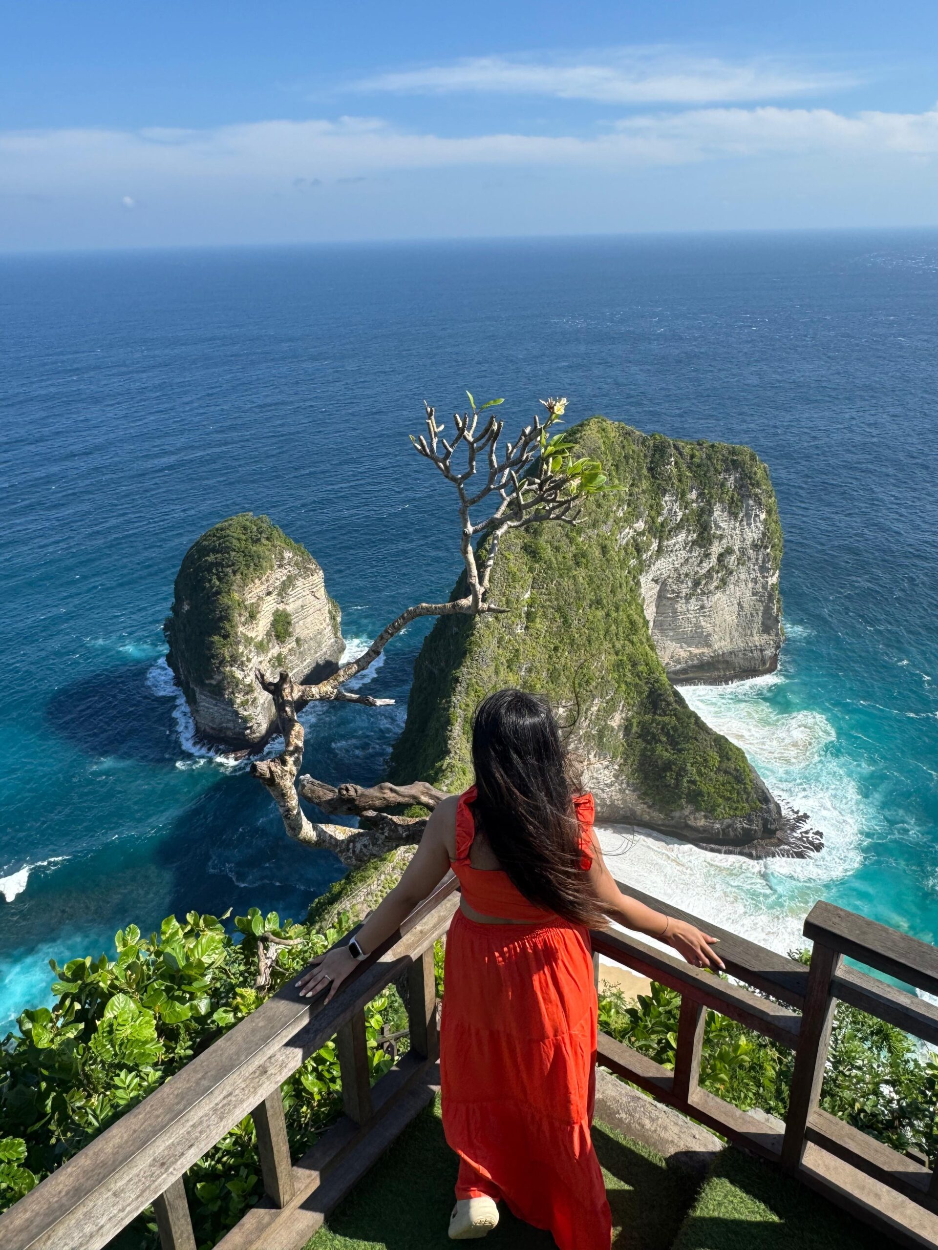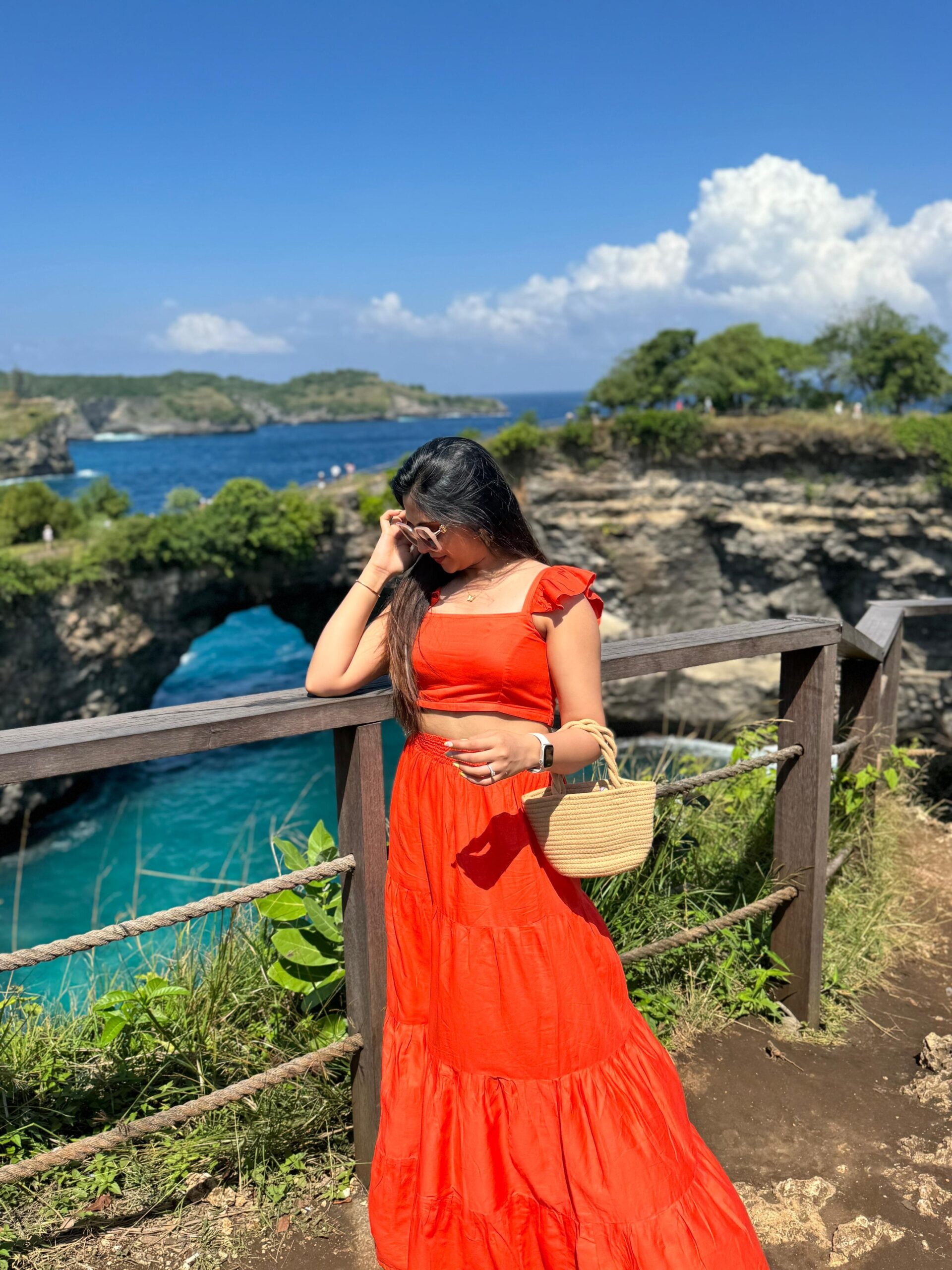 A vibrant orange cotton silk two-piece outfit with a matching skirt and top, perfect for a sunny day by the ocean. The outfit is paired with a straw purse and accessorized with sunglasses.